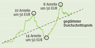 Superfund Ansparpläne bieten Anlegern die Chance, bereits ab 50 EUR monatlich langfristig ein kleines Vermögen aufzubauen. Ein wesentlicher Vorteil der Superfund Ansparpläne ist das Ausnützen des sogenannten Cost-Average-Effekts. Die Grafik zeigt, dass Anleger selbst bei höheren Kursschwankungen immer zu einem geglätteten Durchschnittspreis Anteile erwerben können. Optional auch in Kombination mit dem Goldpreis erhältlich.